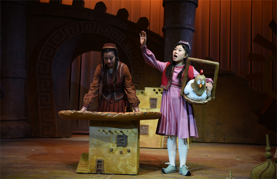 当晚,著名歌唱家王宏伟首次出演儿童歌剧,用扎实的唱功和收放自如的表演,为小朋友们温情塑造了一个充满智慧、幽默风趣的阿凡提。阿凡提的主题曲《骑上我的小毛驴》是一首带有浓郁新疆风格的唱段,仅仅四个乐句的乐段简洁又好听,开篇就交代了阿凡提机智乐观的人物形象。王宏伟骑着一只可爱的小黑驴出场,把这首歌唱得极其生动,令人过耳不忘。与之形成鲜明对比的是巴依老爷、巴依老婆二人出场的唱段《骑上我的高头大马》,用宣叙调的方式刻画了巴依的仗势欺人,巴婆在演唱中的应和也体现出奸诈的性格特征和她对巴依老爷的讨好。与阿凡提的唱段不同,巴依在剧中的主要唱段多是小调旋律,关致京浑厚的男低音很好地表现出了巴依老爷的恶霸形象。《亲爱的小提提》是巴婆的一个趣味十足的唱段,她想从阿凡提口中得到他变金币的法术,于是百般谄媚、讨好,节奏多变,大小调交替的音乐,也体现出了她巧言令色、善变的性格。巴依和巴婆是剧中极为出彩的两个反派人物,关致京和孟萌的扮相极为贴近人物形象,他们二人浑身是戏,用“夸张”的表演引来全场阵阵欢笑。阿娜尔罕的扮演者是童声小歌手刘玥阳,一段《天使的召唤》唱出了她的梦想,也唱出了所有孩子们的心声,这段旋律充满了质朴、善良、单纯和童真,朗朗上口,小歌手干净清澈的声线为此唱段增色不少,也点出了该剧弘扬真、善、美的主旨,告诉孩子们,物质的富裕并不能代替幸福,而人与人的亲密和谐、相互关爱,才是幸福的源泉。