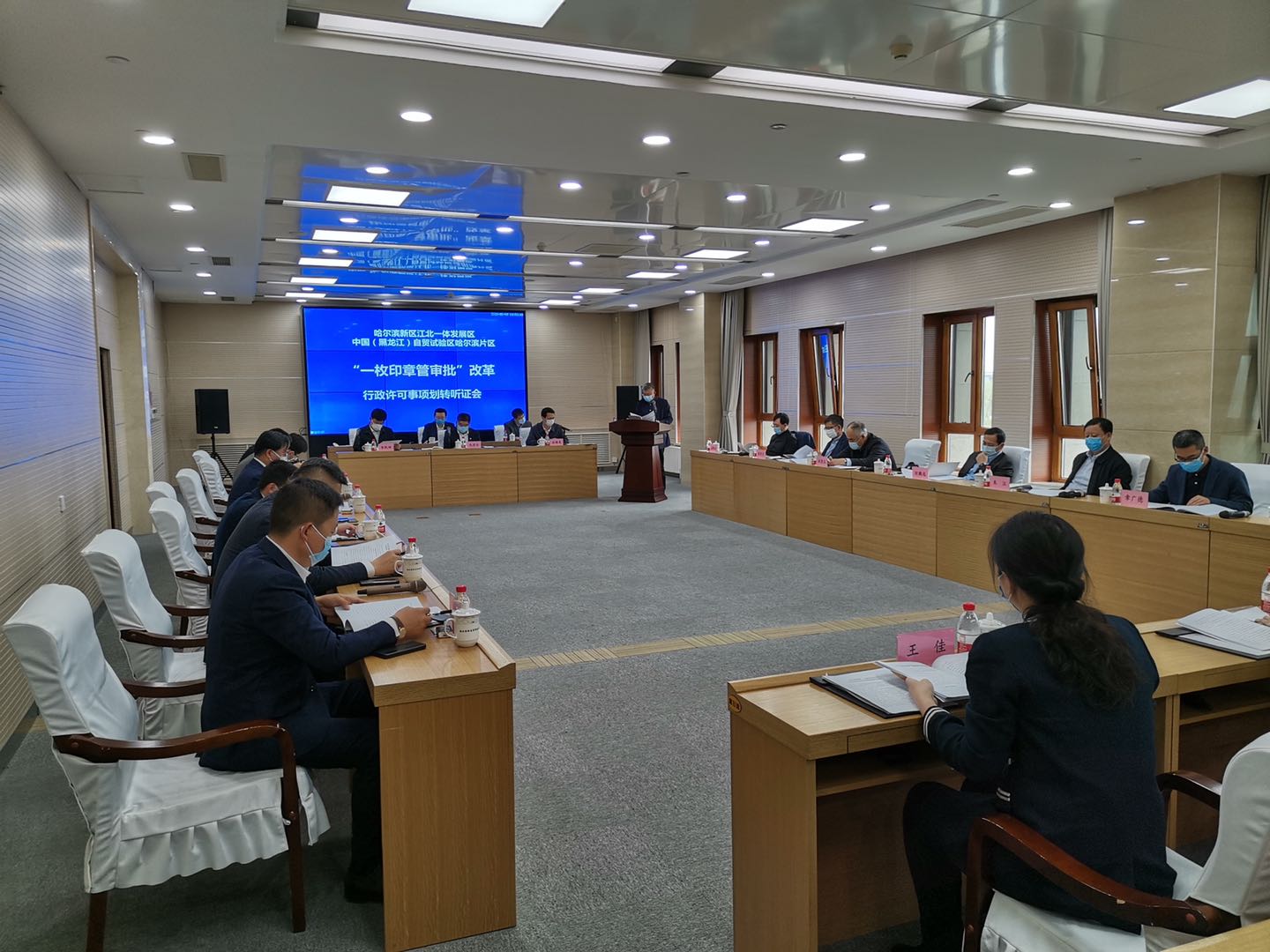 “为了最大限度简化流程,2019年1月1日起,哈尔滨新区江北一体发展区实施了‘一枚印章管审批’”,松北区政府一级调研员、哈尔滨新区行政审批局局长王佳介绍,对于省、市下放的事项、托管利民开发区的事项和区直部门划转的事项,审批局对外发出的证照和文书只需盖上此次启用的新区“行政审批专用章”即可。当年1月7日,哈尔滨新区绿色产业基金(有限合伙)公司领到了盖有“哈尔滨新区管理委员会行政审批专用章”的营业执照,成为新区“一枚印章管审批”首家领到营业执照的企业。