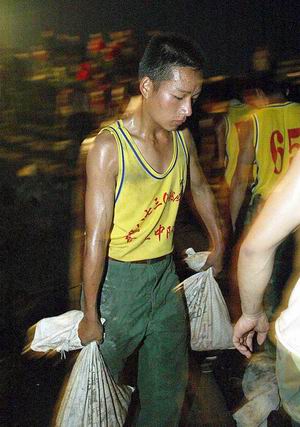 8月23日凌晨,已连续奋战了30多个小时的武警某部战士依然坚守在资江大堤上。湖南省2002年平均降雨比往年同期均值增长三成,全省江河水位全部超过警戒水位。 (新华社记者李刚摄)