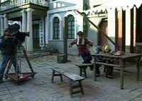 “好,现在我们看到的就是影片画中人的拍摄现场,说到拍摄现场我们可以看到,回忆一下1958年长影在拍摄影片画中人的时候有这样一个情景,画上呢就有这样一位仙女能就这幅画上天然的飘下来,你可以想象一下,既然是画上去的东西,是不可能会动的,所以你看到的画上的仙女究竟是怎么走下来的,首先我们看到这幅画是空白的,而我们在拍摄现场首先在摄影机90度角的位置放了一台升降机,在升降机上我们放置了一个模特,然后拍摄现场的摄影机前面最重要的就是放了一个折射镜,利用光的折射我们把演员的影像投射到这幅画面上去,所以使你们看上去,好象画上有人了,只要我们开动升降机,你看到的就是这位仙女翩翩的从升降机上滑下来,当然你看到的结果就是从画上飘下来,所以过去我们在拍摄人物林空飞舞穿墙而过的时候都是这样拍的,当然现在这种方法已经不用了,有了电脑以后,我们可以用电脑来制作。”