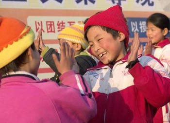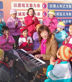 新华社消息:2006年3月14日 校园唱响“八荣八耻”童谣 3月13日,山东省沂南县大庄镇中心小学的学生在拍手学唱“八荣八耻”童谣。 大庄镇中心小学在向学生宣讲胡锦涛总书记提出的“八荣八耻”内容的同时,将“八荣八耻”改编成琅琅上口的童谣,教学生熟练演唱,帮助学生培养和树立正确的荣辱观。