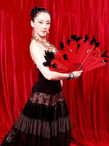 造型点评:棕黑色镂花长裙,简单却见高傲的优雅。手持一把火红羽毛大扇,煽起了斗牛士决斗的欲望。一场复赛的腥风血雨中,谁能跟得上盖丽丽的《节奏》呢?