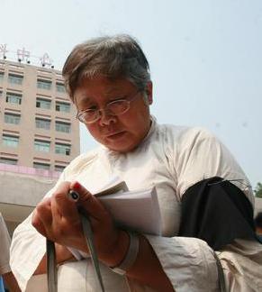群众到北医三院吊唁侯耀文遗体。一位50多岁的中年大姐,身穿白衣,亲手现场写下一首诗,到侯耀文的太平间门口朗读。