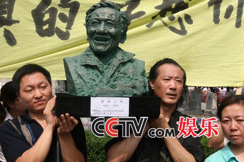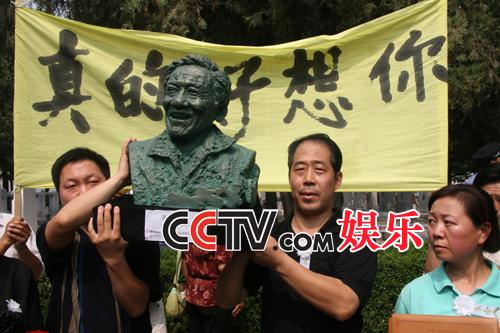 现场有群众挂起“真得好想你!”横幅,高举连夜赶制的侯耀文雕像。