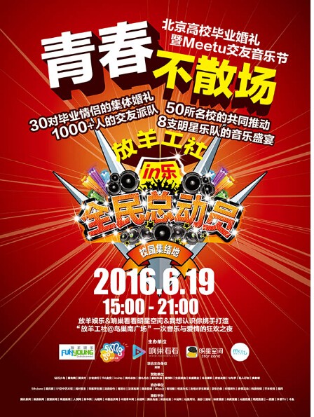 2016年6月19日,北京夏夜的鸟巢南广场,即将迎来一场充满青春气息的校园音乐会。此后持续四个月,顶级娱乐创新品牌放羊工社,即将在这里带领数百万受众,共同打造一系列热烈、沉浸、互动的音乐盛宴。