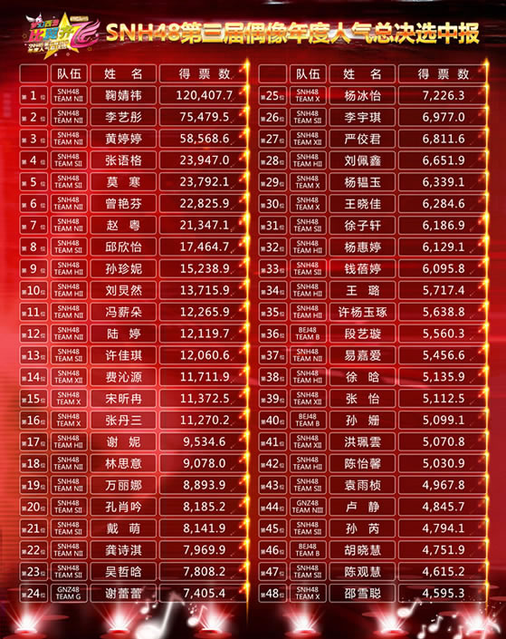 8日晚,SNH48“比翼齐飞”第三届偶像年度人气总决选中间发表结果于SNH48、BEJ48、GNZ48三地星梦剧院联合公布,SNH48人气成员鞠婧祎稳坐榜首,以120407.7票的超高票数成为本次中报的人气王之冠,紧随其后的是李艺彤和黄婷婷,分别以75479.5票、58568.6票位列第二、三名。值得一提的是,相比速报结果,中报排位次序有了显著变化,一期、二期生成员厚积薄发,展现出强劲的爆发力和粉丝号召力,当然也有不少后辈成员入围榜单并获得不错的名次,而首次参选的姐妹团BEJ48和GNZ48也有多名成员入围,成员间你追我赶的良性竞争异常激烈。