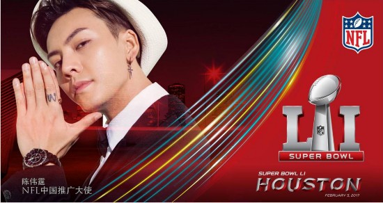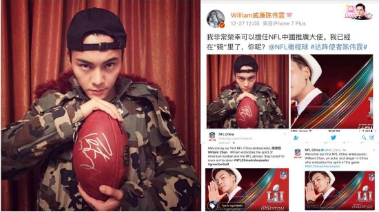 2016年12月20日,NFL美国职业橄榄球大联盟(中国)正式宣布,持续霸屏2016年的全能艺人——陈伟霆,接棒NFL传奇巨星曼宁,成为首位出任NFL推广大使的华人明星。