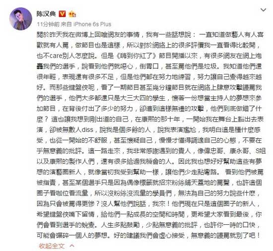 随后陈汉典发文表示: 一直知道做艺人有人喜欢就有人骂,所以对于网络上的很多评价一直看得比较开,也不care别人怎么说。但这些选手都是新人,面对这些攻击他们不知道怎么面对,网友没有了解他们就肆意攻击,一时的口快可能会碾碎一个人的梦想。希望能多给新人一些空间和时间。