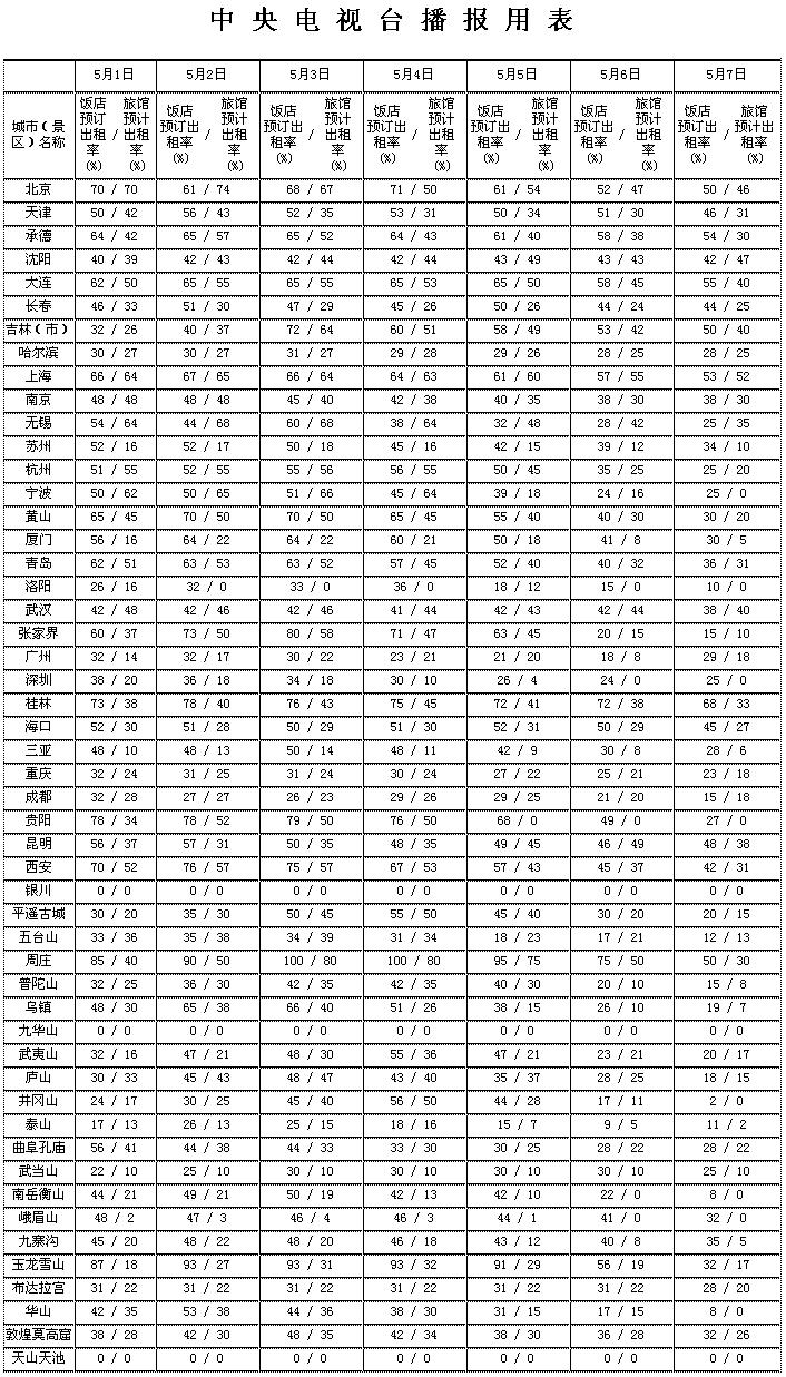 民航方面:一些重点城市的出港航班、出行列车已经开始紧张。4月30日航班机票已经预定已经超过90%的航线有:北京至厦门、桂林、三亚、昆明、武夷山,天津至青岛、杭州-厦门、上海、福州、海口、成都、广州,南京至张家界、香港、成都、昆明、桂林、南宁,杭州至澳门、北京、香港、昆明,宁波至香港、澳门、昆明,西安至海口、昆明、桂林,深圳至上海、西安、襄樊,重庆至桂林、北海、大连、济南、杭州,沈阳至郑州、昆明、上海、厦门,长春至烟台-深圳、青岛-深圳、上海、北京-昆明,海口至昆明、成都、贵阳,三亚至合肥,黄山至香港、厦门、福州。5月1日民航预定已经超过90%的航线有:上海至武夷山、张家界,广州至昆明、杭州、宁波、南京、黄山、衡阳、桂林、青岛、张家界,北京至厦门、张家界、桂林、三亚、敦煌、武夷山、泰山,天津至大连、上海,西安至桂林、昆明,哈尔滨至烟台、重庆、海口、桂林、厦门、昆明、武汉,深圳至贵阳、海口、上海、杭州、昆明、桂林、西安、成都,杭州至澳门、桂林、香港、昆明,青岛至重庆,重庆至桂林、北海、大连、青岛、张家界、厦门,南京至桂林、北京、昆明、珠海,宁波至重庆、成都、昆明、厦门,长春至济南-长沙、绵阳-昆明、青岛、上海-厦门-珠海,海口至澳门、贵阳,三亚至成都、天津;5月2日航班预定已经超过90%的有:北京至张家界、武夷山,天津至香港,广州至武夷山、北海、张家界,重庆至桂林、张家界,深圳至海口、杭州、昆明,西安至海口,南京至桂林、大连,杭州至昆明、海口、曼谷,宁波至香港、成都、昆明,长春至西安-成都、海口,三亚至福州;5月3日民航预定票已经超过90%的有:北京至敦煌、泰山,天津至香港、长沙-版纳,南京至桂林,深圳至海口、贵阳,宁波至昆明,无锡至昆明、佛山,黄山至福州、厦门。其中,重庆4月30日至桂林、北海、大连、济南、杭州,5月1日至桂林、北海、大连、青岛、张家界、厦门,5月2日至桂林、张家界,5月7日至大连的机票已售完。