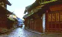 由于古城坐落在西北方向狮子山的怀抱里,东北方向的金虹山和象山挡住了玉龙雪山的寒风,使得古城夏无酷暑,冬无严寒,春秋温爽,年平均气温12.6度。从地图上看小城分为三个部分,城北以四方街为中心,元明清以来一直是繁华商业区;城东曾是清代流官府衙,现已荡然无存,只留下文庙和武庙;城南土司木府,是小城的政治经济和权力的象征,尽管它只是一座土司的宅院,但它的奢华与恢弘并不亚于任何一座王公贵胄官邸。古城曲折有致的古老街巷,把一座座古朴民居连成一片,形成了主街伴河、小巷临水、跨河筑楼的独特景观,构成了人与自然和谐统一的空间。