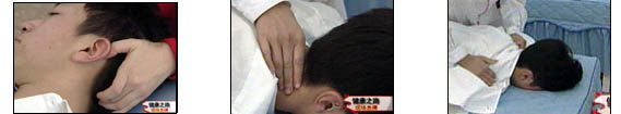 主持人:我们来看一段保健按摩手法演示的小片子: 臧福科:在颈部、头面部的一些结合穴位的按摩方法可以安神定志、清热明目,在脖子上按揉可以解除肌肉疲劳,还要对肩部和后背部进行按揉,因为颈部的肌肉都分布在这里,最后再对胳膊进行按摩。