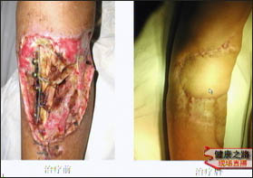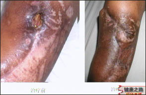 主持人:为什么慢性骨髓炎的治疗很困难? 冯峰:从古到今历代医家都把慢性骨髓炎列为一种疑难性疾病,之所以治疗起来比较困难是因为慢性骨髓炎的疗程长,全身有消耗性的表现,细菌容易在病灶内残留,即使用药也很难达到病灶内,加之病人局部的一些病理改变,病情可以反复发作,不宜根治。治疗应该掌握一个原则,首先要解决它的根本问题,要彻底清除病灶、刮除脓液和炎性组织、消灭死腔,让细菌不能继续残留,改善局部的血液循环。在消除病灶时还要遵循两个原则,一个是要彻底清除病灶,另外还要保证病灶有一个通畅的引流,还应该考虑如何提高局部的抗生素浓度,在治疗上要达到三个目的1、如何缩短疗程。2、如何降低复发率。3、尽量保存肢体功能。 慢性骨髓炎常见的三种类型 1、 骨折已愈合,遗留有窦道和创面 2、 慢性骨髓炎伴有皮肤、骨骼缺损 3、 慢性骨髓炎伤口已愈合,骨折不愈合 王新卫:如图第一种类型的治疗通常是用中药进行治疗,把中药放入窦道里,去除腐烂的组织,经过一段时间的治疗,窦道已经完全消失了。第二种类型的治疗也是用中药进行冲洗治疗,中药冲洗的作用主要有活血化瘀、改善局部血液循环、解毒杀菌、清洁创面,最终达到创面愈合。来看一个片子这是在给一位脚部的慢性骨髓炎病人进行中药冲洗治疗,冲洗机可以调节冲洗的深度、部位、温度、压力等,然后进行循环冲洗。如图冲洗治疗后效果是非常好的。一般来说创面在10平方厘米以下需要冲洗1个月左右,每天冲洗两次,每次冲洗30分钟。如图像这种病人应该早期进行骨皮瓣的移植,对于这类病人要掌握一个原则,病人的创面要新鲜,如果创面的分泌物比较多、有脓液、有腐烂的组织,在中药冲洗下净化创面、改善局部的血供然后再做创面的关闭。如图这是术后两年的回访情况,病人的关节功能恢复得非常好。第三种类型在临床上是比较多见的,如图中间的是一张胫骨上端的慢性骨髓炎,把好腿上的小骨头移植到缺损处,移植后可以看到骨折已经愈合,但是骨头比较细,病人还不能完全负重,经过一年的随访小骨头现在已经增粗了很多,几乎与原来的胫骨一样粗,这种情况就可以完全负重了。骨头增粗对于儿童比较明显,大约两年时间就可以了,对于成人增粗大约需要4-5年。