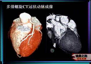 主持人:CT检查的作用又是什么呢? 张兆琪:CT检查是最近几年才兴起的一种技术,过去只有超高速CT可以对心脏进行检查,但是对冠心病检查仍然有一定的限度。现在有了多排的螺旋CT,这种技术是一个非常新的技术,可以直接把冠状动脉血管显示出来。如图这就是多排螺旋CT冠状动脉成像,可以非常清楚地看到冠状动脉的血管,如果有了狭窄还可以看到狭窄的程度和狭窄部位,冠心病治疗后如果放了一个支架或搭了桥都可以把这些血管显示清楚。因此这种方法可以观察冠状动脉疾病以及治疗后的情况。