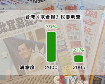 解说:台湾政局未来的走向,显然在这次选举中埋下了更多的伏笔。在选举结果公布后的第二天,岛内《联合报》所做的民意调查显示,民众对陈水扁的满意度再创历史新低,降至二成一,与2000年刚刚上任时的七成九相比,可谓一落千丈,而在外界看来,只会拼口水不会拼经济的民进党,正在跌入外部四面楚歌内部四分五裂的境地。