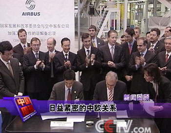回顾2005中国外交,欧盟的25个成员国,中国的高层领导人造访了14个,往来之频繁、关系之紧密,让中欧关系达到了30年来前所未有的高度。本周,在温家宝此行的首站法国,中法共签署了涉及金融、铁路、航天航空、能源等领域共16项合作文件,其中包括购买150架空中客车飞机的协议。