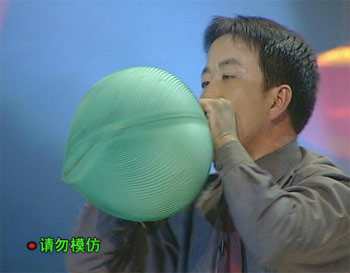 吹热水袋:我们经常用“吹牛皮”来形容人说话夸大其词,本期节目真的来了一位非常会“吹”的,您可别误会他可不是说大话,而且他吹得不是“牛皮”是胶皮――“见过吹牛皮的,没见过吹热水袋的!”