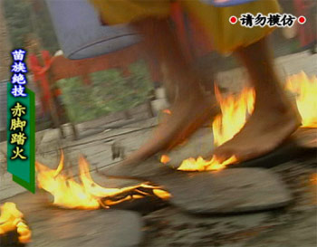 踏火吞碗:人们常说饿的时候能“吞下一头牛”,不知道今天这位是不是“饿坏了”,居然连碗也要吞下去,而且是踏火吞碗!